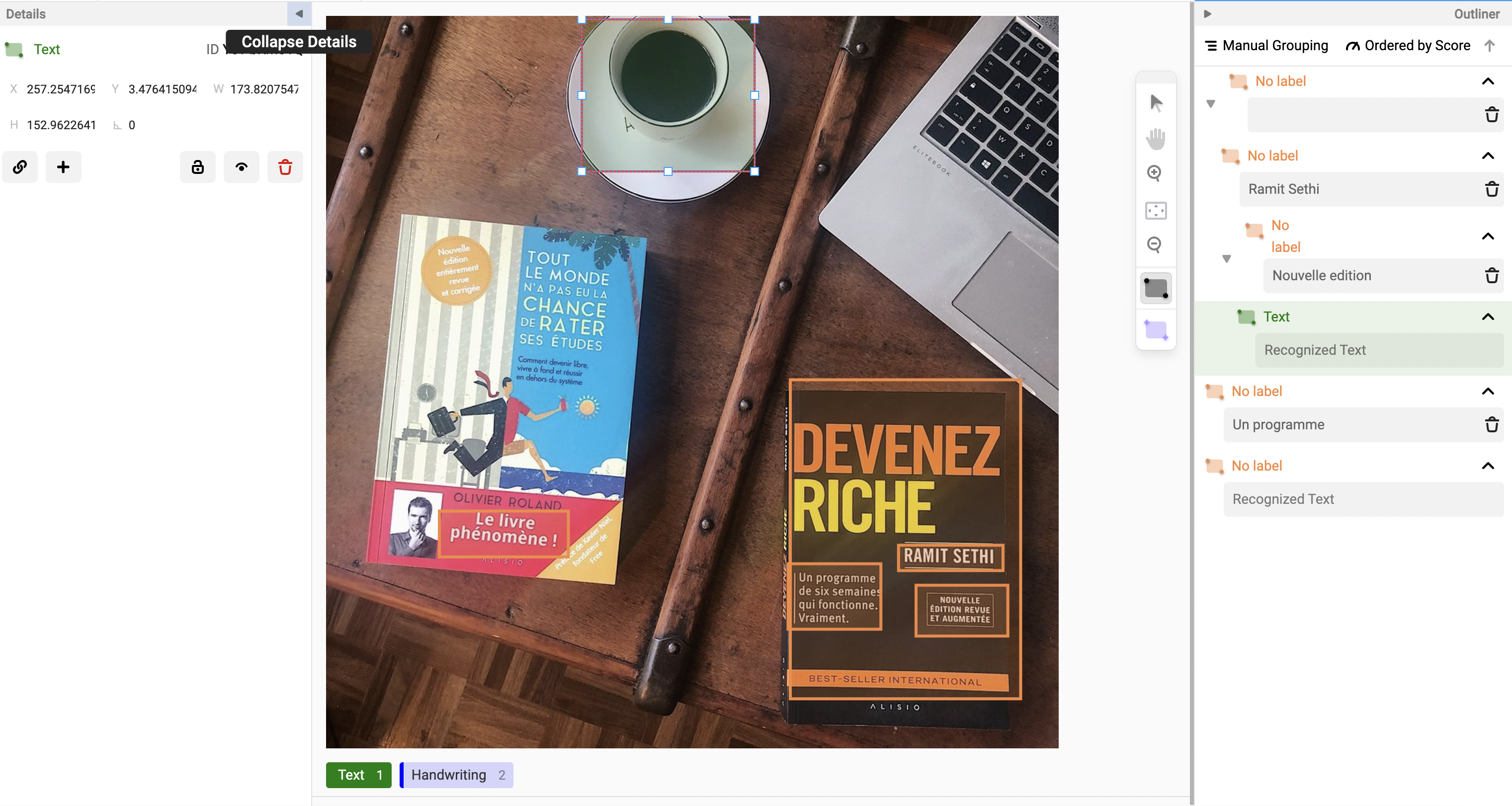 Outliner is the area where you can see all the details about annotation, regions, and labeling history. It is split into two panels, named Outliner and Details. Figure 3 shows the appearance of the Outliner panel on the right of the image and Details panel on the left of the image.