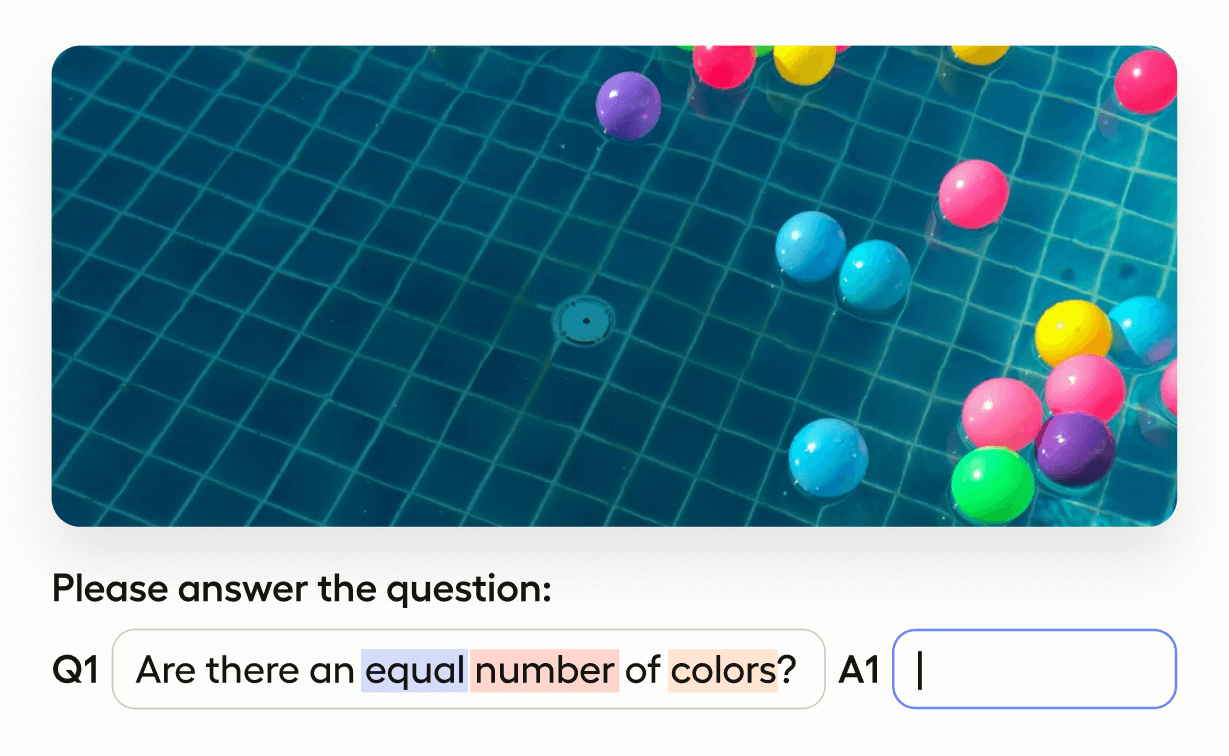 Create a dataset with answered questions about images using this visual question answering template. In response to an image, annotators can provide free-text answers to a question and also label components of a question with relevant aspects.